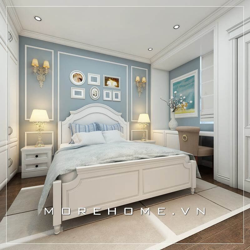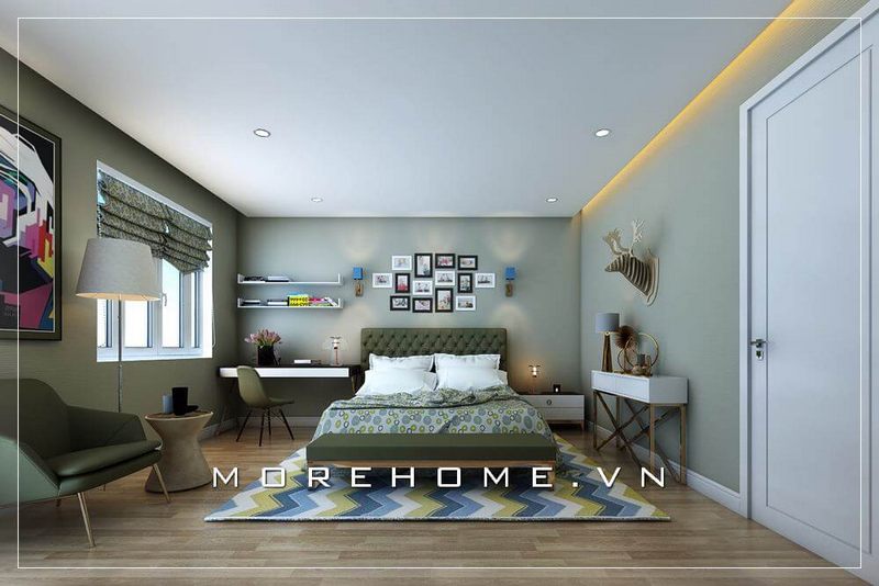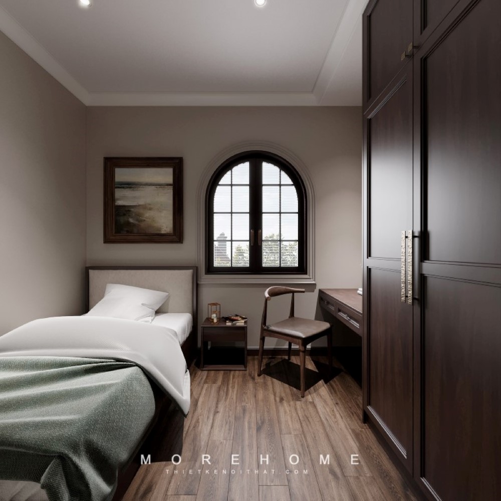 Phòng ngủ phong cách indochine được thi công bởi Morehome đem đến không gian nghỉ ngơi, thư giãn thoải mái, tiện nghi sau những giờ làm việc dài