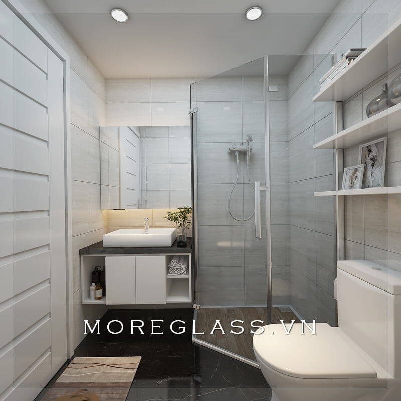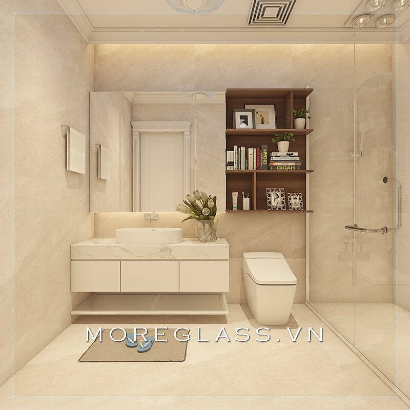 Vách tắm kính 180 độ phân chia giữa 2 khu vực phòng tắm đứng tránh văng nước gây ướt át khó chịu tới các khu vực khác trong phòng.