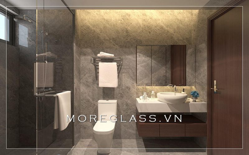 Sử dụng vách kính cường lực ngăn cách bởi không gian vệ sinh và phòng ngủ, tạo không gian thoáng rộng hơn.