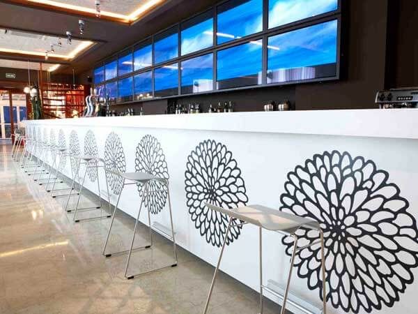 Quầy lễ tân đẹp đá nhân tạo tô điểm trang trí những hình hoa độc đáo điểm nhấn riêng cho khu vực.