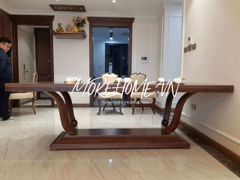 Thi công bàn ăn hình chữ nhật gỗ tự nhiên có chân trụ giữa tiện lợi cho sử dụng, tính thẩm mỹ cao cho không gian