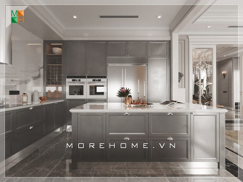 Bàn đảo bếp với kiểu dáng thiết kế hiện đại góp phần giúp không gian thật tinh tế và sang trọng.