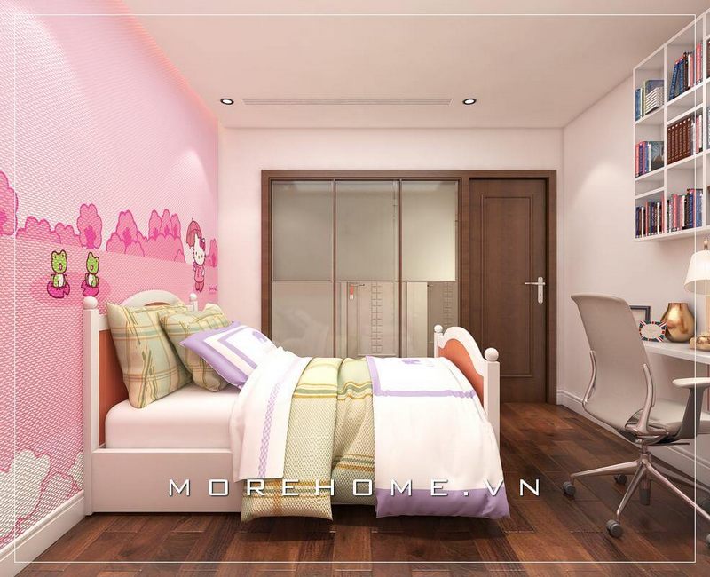 Phòng ngủ của bé gái đáng yêu, xinh xắn với sắc hồng độc đáo cùng hình ảnh kitty ngộ nghĩnh