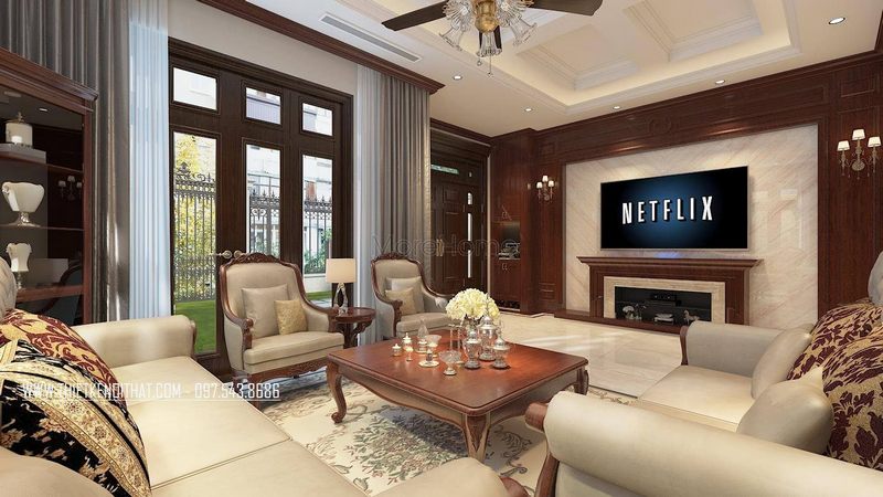 Một mẫu thiết kế phòng khách sang trọng và đẳng cấp cho biệt thự được tạo ra bởi sự kết hợp hài hòa giữa các màu nội thất độc đáo, tạo nên một không gian thu hút.